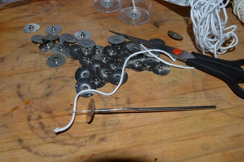 Cut the prepared wicks to 1 1/4 inch lengths.Using a 1.75 mm crochet hook (US no. 7), thread the wick through the hole in the wick tab. Secure the wick in place with a dab of wax on the underside of the tab. While the wax is still warm, place the tab securely inside the tea light cup, centering it. Press down firmly to secure the wick tab in place. The wick has a cotton core, primed with wax. (See here for more about priming the wick). It will stand stiff and upright in the cup. If it doesn’t, help it with your fingers.
